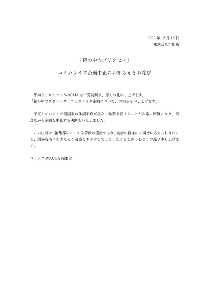 「鏡の中のプリンセス」コミカライズ企画中止のお知らせ